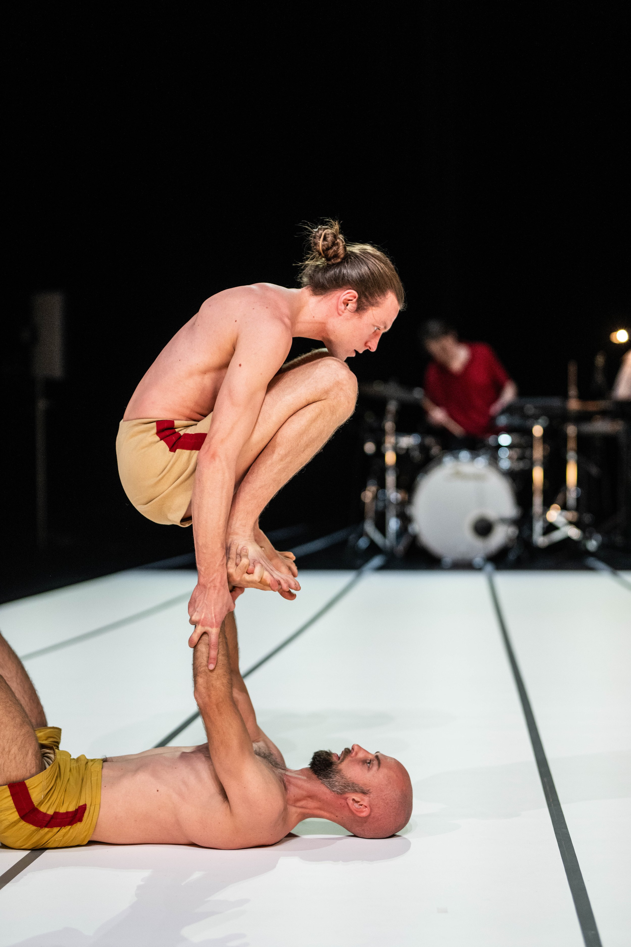 With great effort and concentration, the performers jointly search for balance, equilibrium and harmony without shying away from humour. They challenge and support each other and take turns leading the dance. Through uninterrupted mutual contact, the interweaving of touching and being touched develops as the underlying melody of the performance, one that is attuned to the live accompaniment of Andrea Belfi, the Italian experimental percussionist.